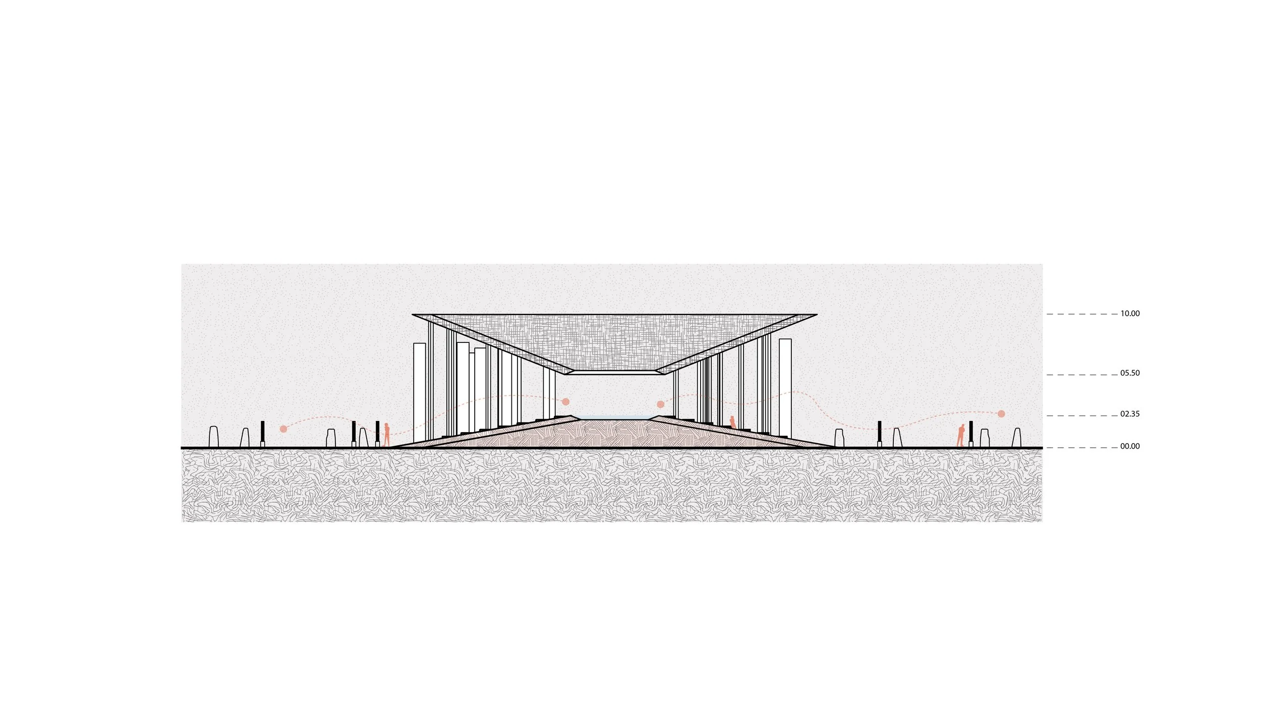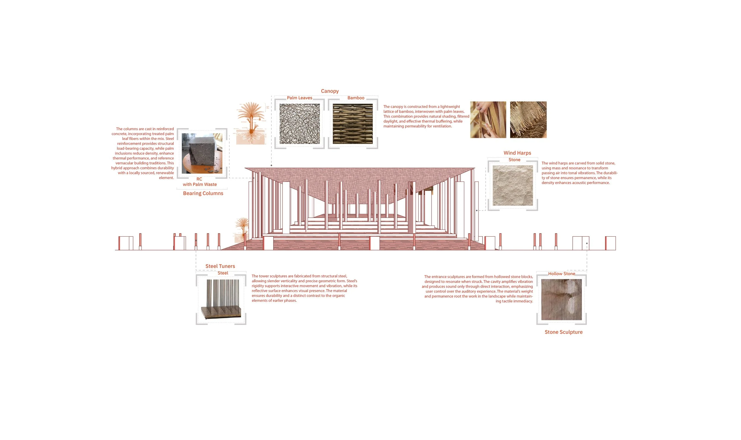 Our proposal builds on our studio’s ongoing research and practice in craft, sustainability, and materiality. In previous projects such as Sabil, we explored weaving as both technique and metaphor — a way to intertwine heritage with contemporary public space. In Sada, this ethos takes new form: the suspended canopy cloud revives the ancient practice of weaving palm leaves and fibers as shelter, while our experimental use of palm tree waste as reinforcement for concrete columns opens new pathways for sustainable construction rooted in local resources. Through these gestures, the project repositions craft not as ornament, but as structure, resilience, and identity.
