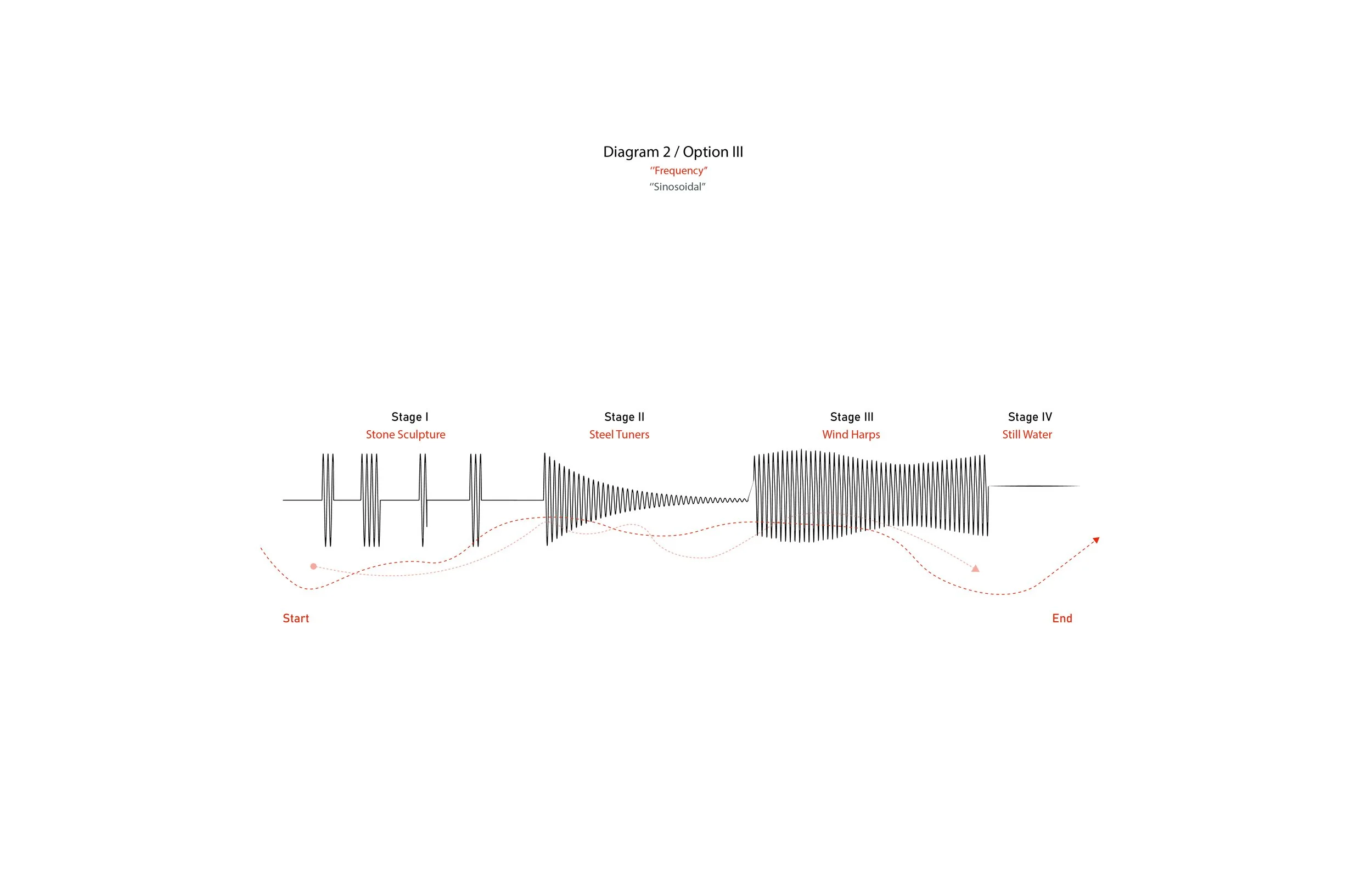 The journey begins at the outer edge, where sculptural stone forms respond directly to touch. When rubbed or struck, they produce resonant tones that vanish as soon as interaction ceases, embodying our desire to command and shape the world around us. Further in, slender steel columns stand in dense clusters, creating lingering tones as they are gently pushed against each other. These vibrations ripple beyond the initial action, reminding visitors that cause and effect extend beyond control. Deeper within, vertical wind harps made out of stone, where wind pass through the vertical gap between the two columns and plays the strings that are installed in the middle, generating egoless beautiful sounds. Here, visitors shift from makers to listeners, surrendering fully to the rhythms of nature. At the center, a raised circular water basin mirrors the sky. Subtle vibrations appear as ripples across its surface, transforming sound into a visible dance. In this moment, the visitor witnesses vibration without influencing it, experiencing oneness with the unseen forces that bind us.