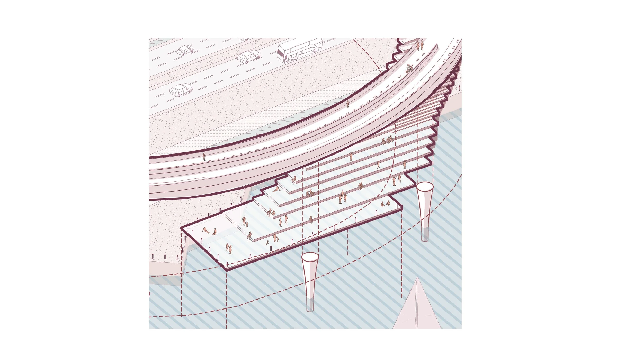 Al-Bidda Wasl proposes a suspended pedestrian plaza that rises above the highway to connect the Corniche with Al-Bidda Park. Designed as both infrastructure and public realm, the plaza takes the form of a 100-meter-radius ring that offers a 628-meter continuous promenade. This circular path is more than a bridge: it is a new urban destination. Walking and cycling lanes intertwine with shaded gardens, communal seating, kiosks, a stepped plaza for gatherings, and playful interventions such as children’s hovering trampolines. In doing so, the project creates not only connectivity, but also vibrancy and inclusivity — transforming a point of separation into a civic space of encounter.