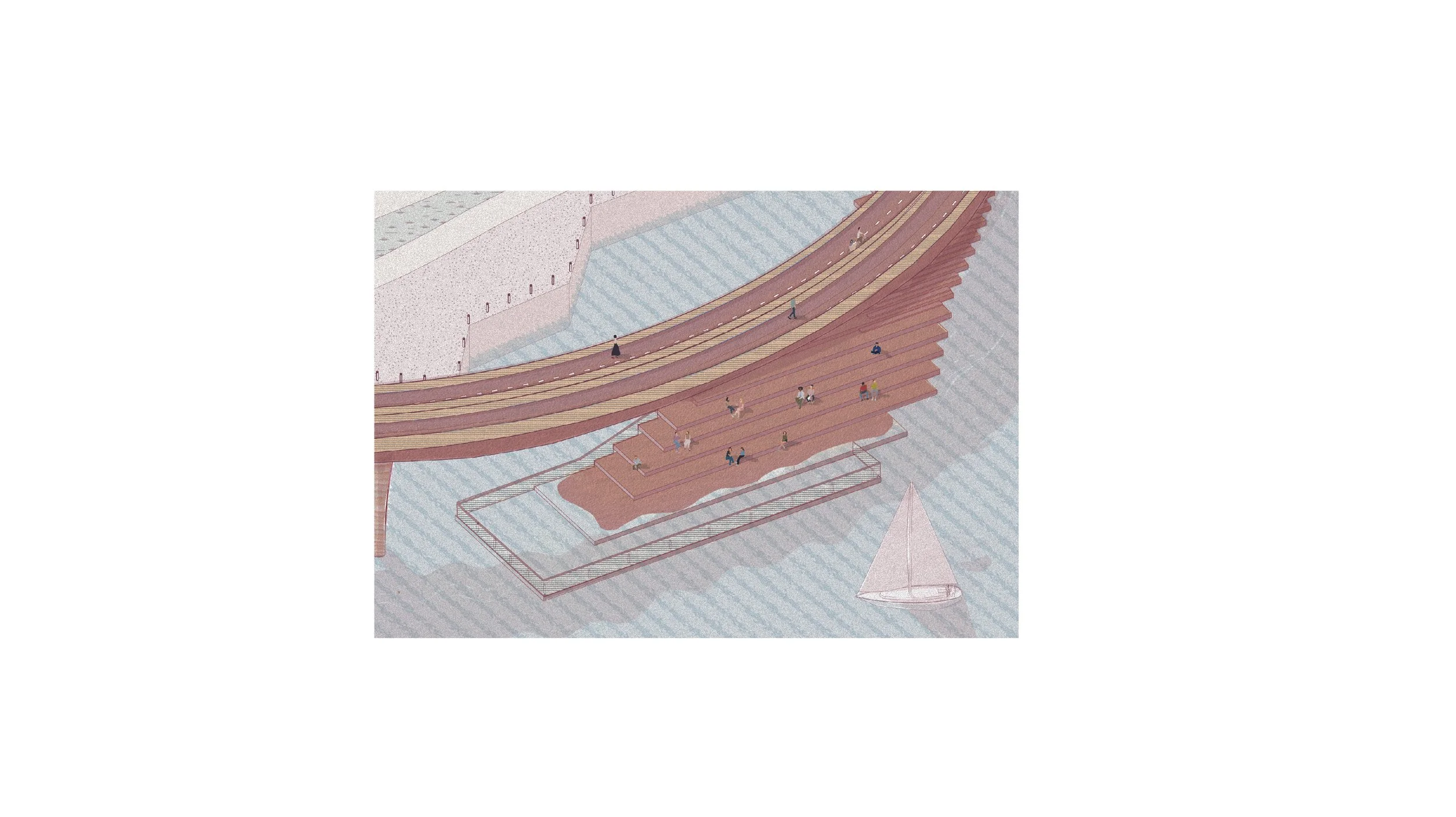 Sustainability and memory are layered into its material and spatial language. Structural bases are built from rammed earth, their warm tones evoking Doha’s soil while providing thermal mass and a low-carbon footprint. The suspended ring is formed of steel for lightness and durability, while the deck is finished in breathable terracotta tiles that naturally cool underfoot. Overhead, canopies inspired by dhow sails and woven fishing nets filter sunlight, catching the breeze the sail moves an sways creating a dynamic skyline for the city that resonates with Qatar’s seafaring heritage and craft traditions. Together, these materials and forms root the plaza in place, while responding intelligently to climate and comfort.