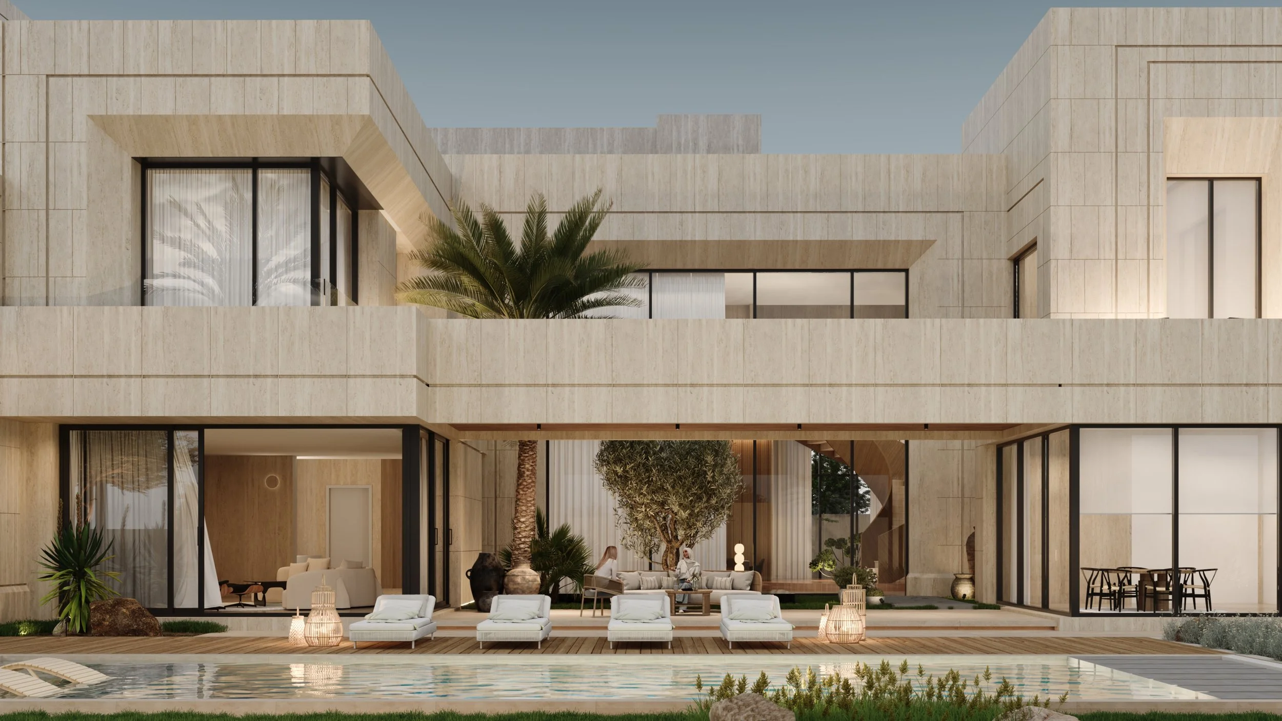 Located in Al-Qaseem, Saudi Arabia, this private residence is defined by a composition of interlocking volumes clad in warm limestone, creating a dialogue between mass and void. The design emphasizes a strong connection to the surrounding landscape, integrating shaded courtyards, recessed terraces, and deep overhangs to mitigate the region’s climate while enhancing spatial fluidity.