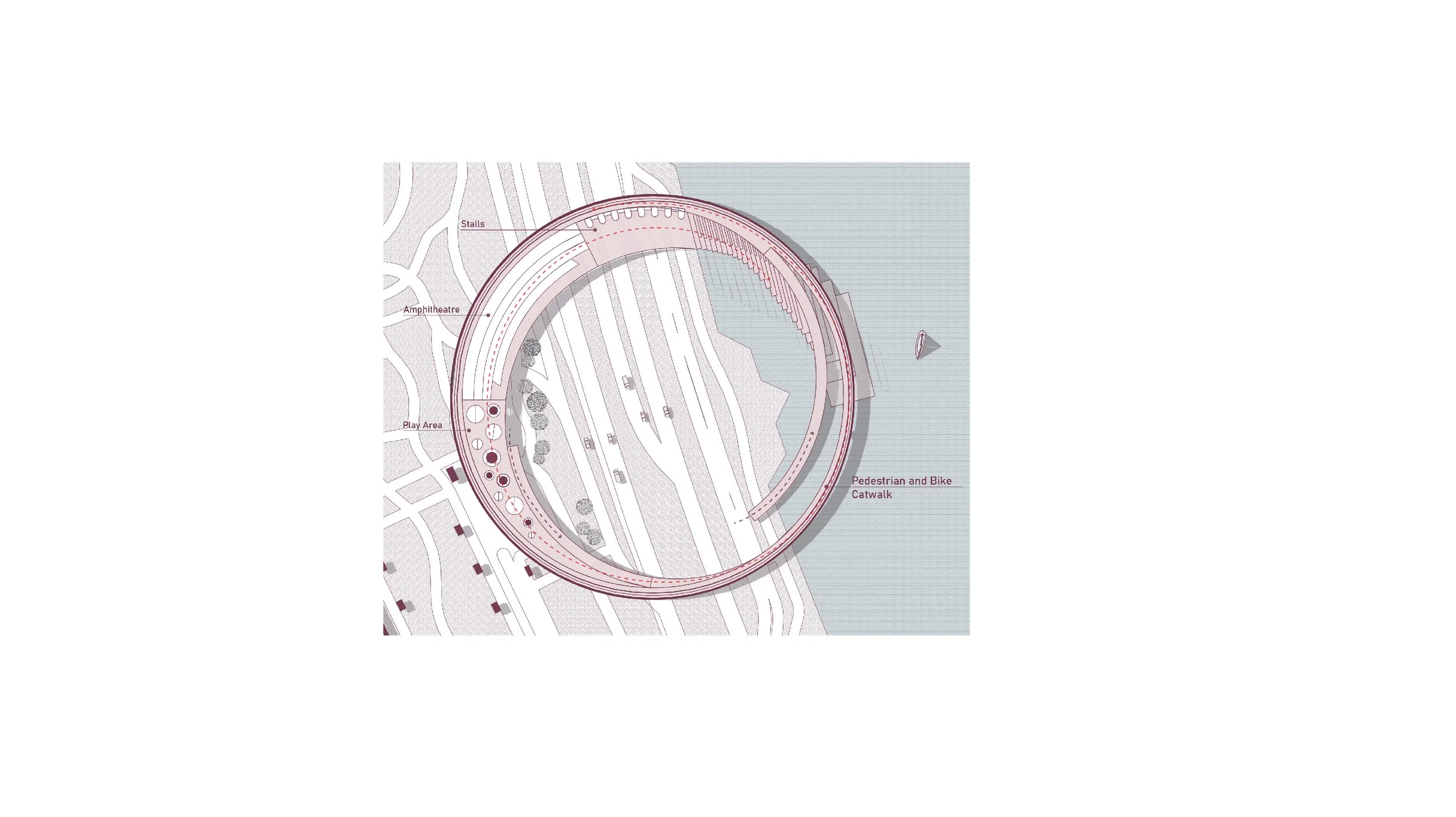 Sustainability is embedded at multiple levels. Rammed earth structural walls and breathable terracotta tiles provide low-carbon, thermally resilient materiality. Suspended steel achieves lightness and permanence, while canopies derived from dhow sails and woven nets reinterpret local craft and heritage. These layers of form and material anchor the plaza in place, while offering microclimatic comfort for year-round usability.