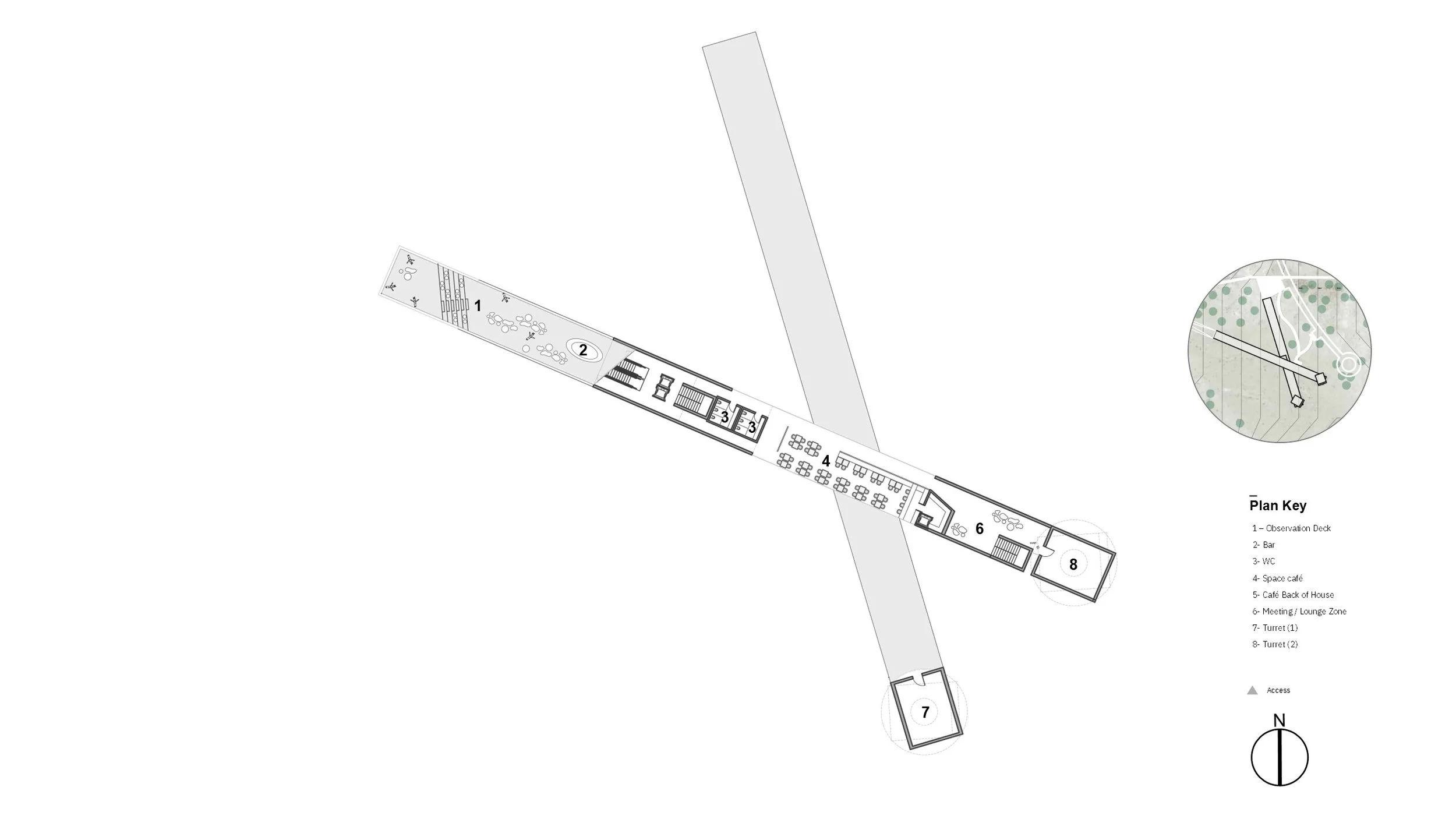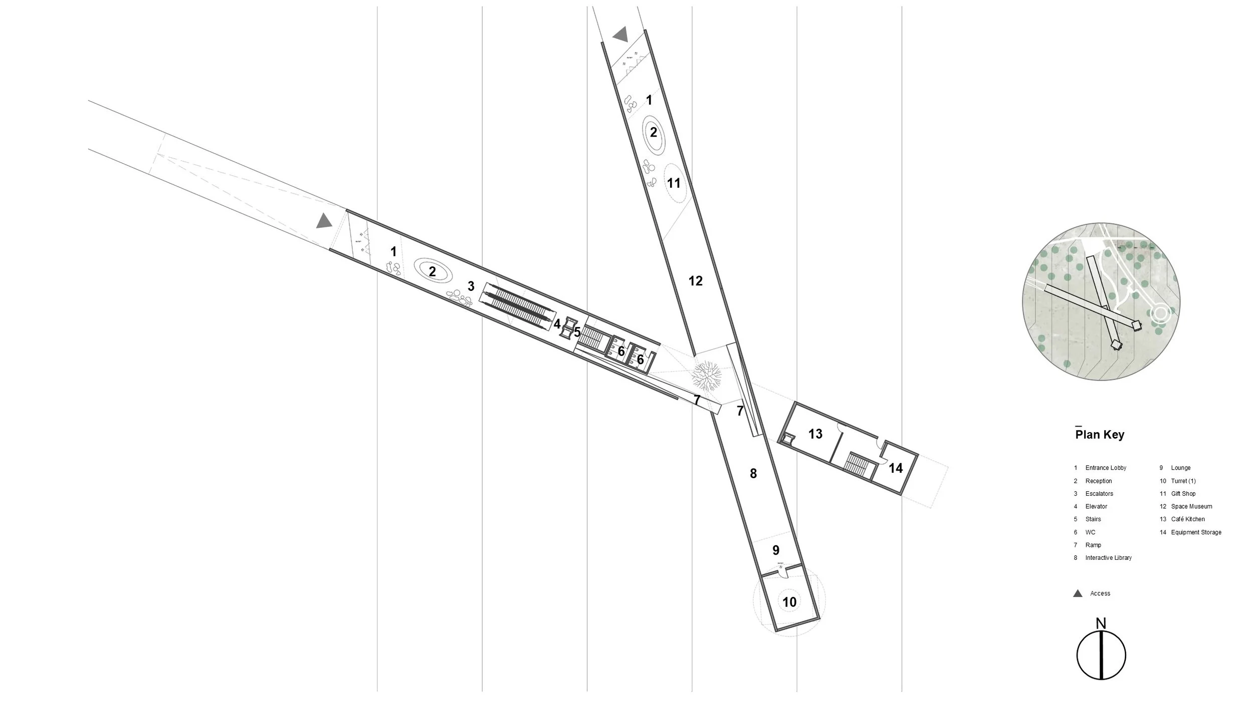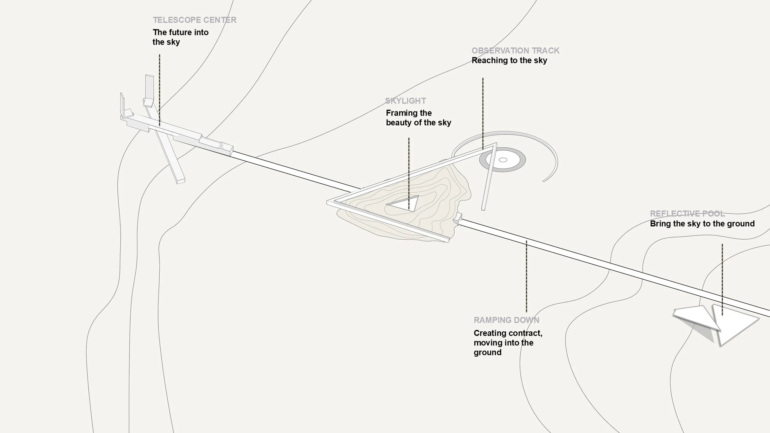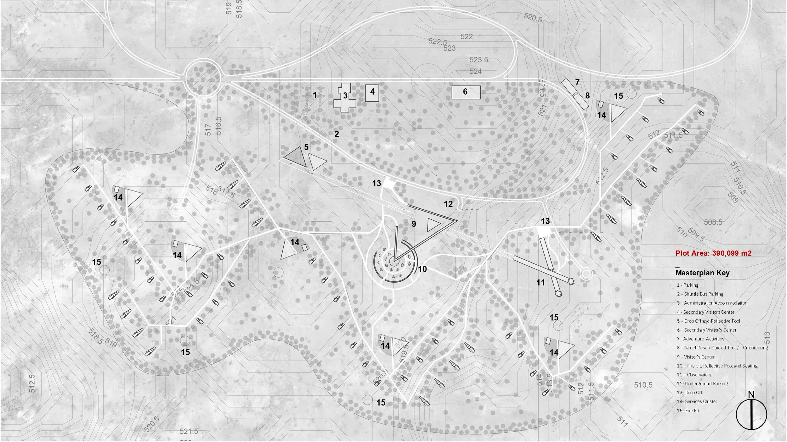 The journey culminates at the Observatory, where architecture transitions from the grounded and contemplative to the vertical and technological. Rotated turret towers house telescopes and observation spaces, their form and materiality contrasting with the buried visitor facilities while symbolically reaching toward the sky. Programmatically, the Observatory integrates educational galleries, interactive libraries, lounges, and viewing decks into a continuous axis of learning and discovery. Distributed service clusters, fire pits, and tented accommodations are positioned to maintain privacy and darkness, essential for stargazing, while reinforcing a collective rhythm of movement across the site. Together, the masterplan frames the desert not as a backdrop, but as an active participant—where terrain, architecture, and celestial observation merge into a singular spatial experience.