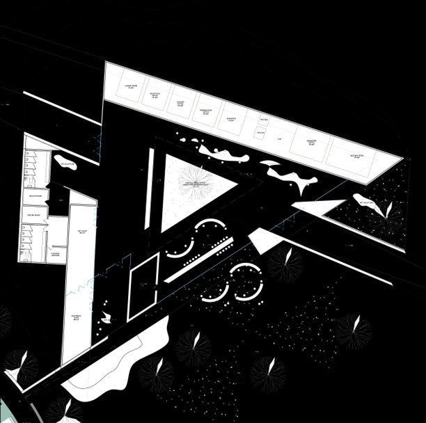 At the heart of the project lies a linear experiential narrative described as “bringing the sky to the ground.” From the main drop-off, visitors are guided along a pedestrian axis that unfolds as a spatial story: a reflective black pool mirrors the night sky, while subtle ramps draw the body downward, creating moments of compression and release. The Visitor’s Center is entirely concealed within an excavated mound, formed through subtraction rather than addition. Inside, a dramatic void carved into the terrain is centered around an oasis and crowned by a large skylight, allowing daylight, and at night, the stars, to penetrate deep into the earth. Above, a triangular observation deck rises gradually to nine meters, framing expansive views of the camp and desert while marking a moment of orientation and gathering.