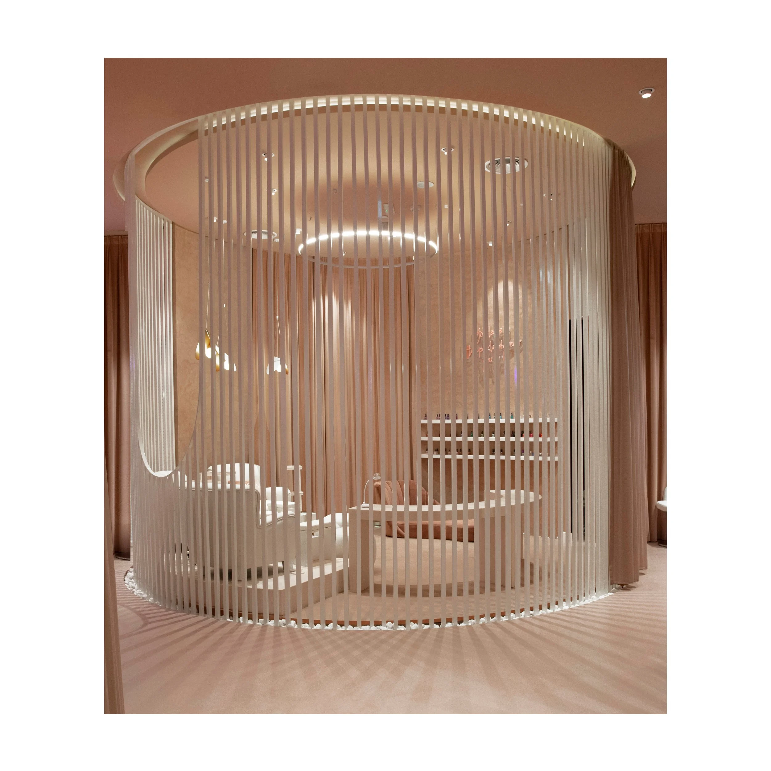 The large open space houses multiple functions within each oasis; a reception and coffee/juice bar area, hair styling, hair spa, nails, Moroccan hammam and a kid’s area. The allocation of each area was defined through the use of soft and curved geometries defined by light whereby louvres act as veils for privacy. The rooms at the edges of the space house massage rooms, wax rooms, changing rooms, showers, toilets and administrative, staff and upkeep functions. The treatment rooms are differentiated from the main open space as pops of color are introduced through the use of ceramic coated glass. The space hosts a playful interplay of materials as the industrial white aluminum louvres are juxtaposed by the velvet fabric texture of the curtains and the soft pink undertones of the flooring.